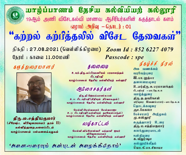 யாழ்ப்பாணம் தேசிய கல்வியற் கல்லூரியின் “ஏழாம் அறிவு” தொடர் - 01 ஆனது 27.08.2021ஆம் திகதியன்று மு.ப 11.00 மணிக்கு பீடாதிபதி உயர்திரு சுப்பிரமணியம் பரமானந்தம் அவர்களின் தலைமையில் நிழ்நிலையில் நடைபெறவுள்ளது. இதில் “கற்றல் கற்பித்தலில் விசேட தேவைகள்" எனும் தலைப்பில் கருத்துரையாளராக திரு.ம.சத்தியகுமார் (சிரேஷ்ட விரிவுரையாளர் தரம் II, கல்வித்துறை, கலைப்பீடம், யாழ்ப்பாணம் பல்கலைக்கழகம்) அவர்கள் கலந்துகொண்டு கருத்துரைகளை வழங்கவுள்ளார். இந்நிகழ்வில் அனைவரையும் கலந்து சிறப்பிக்குமாறு அன்புடன் அழைக்கின்றோம். Zoom ID: 852 6227 4079, Passcode: spe