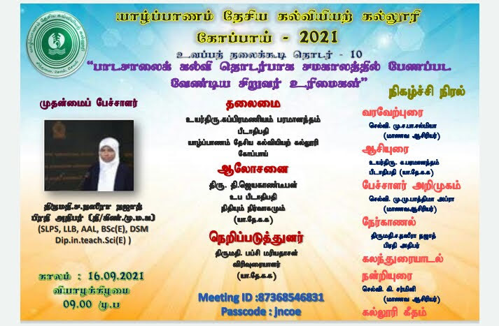 யாழ்ப்பாணம் தேசிய கல்வியியற் கல்லூரியின் “உவப்பத் தலைக்கூடி” தொடர் - 10 ஆனது 16.09.2021ஆம் திகதியன்று மு.ப 9.00 மணிக்கு பீடாதிபதி உயர்திரு சுப்பிரமணியம் பரமானந்தம் அவர்களின் தலைமையில் நிழ்நிலையில் நடைபெறவுள்ளது. இதில் முதன்மைப் பேச்சாளராக திருமதி.ச.நஸீரா நஜாத் பிரதி அதிபர் (தி/கிண் .மு.ம.க.) (SLPS, LLB, AAL, BSc[E], DSM Dip.in.teach.Sci(E) ) அவர்கள் கலந்துகொண்டு "பாடசாலைக் கல்வி தொடர்பாக சமகாலத்தில் பேணப்பட வேண்டிய சிறுவர் உரிமைகள்” எனும் தலைப்பில் கருத்துரை வழங்கவுள்ளார். இந்நிகழ்வில் அனைவரையும் பங்குகொண்டு பயன்பெறுமாறு அன்புடன் அழைக்கின்றோம். Zoom ID: 873 6854 6831, Passcode: jncoe